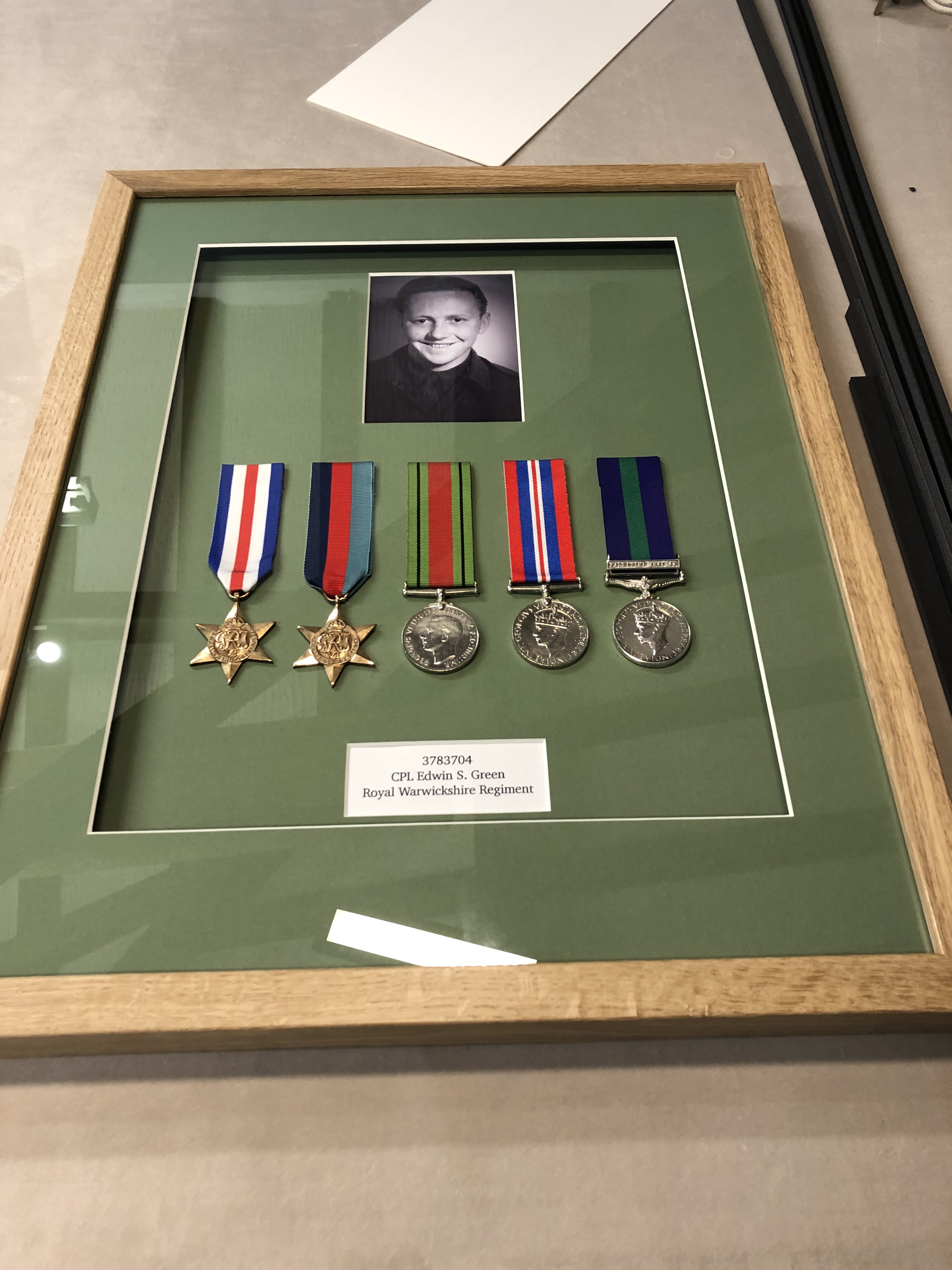 The medals are double mounted with a hidden slip in a solid oak frame with a hand waxed finish.