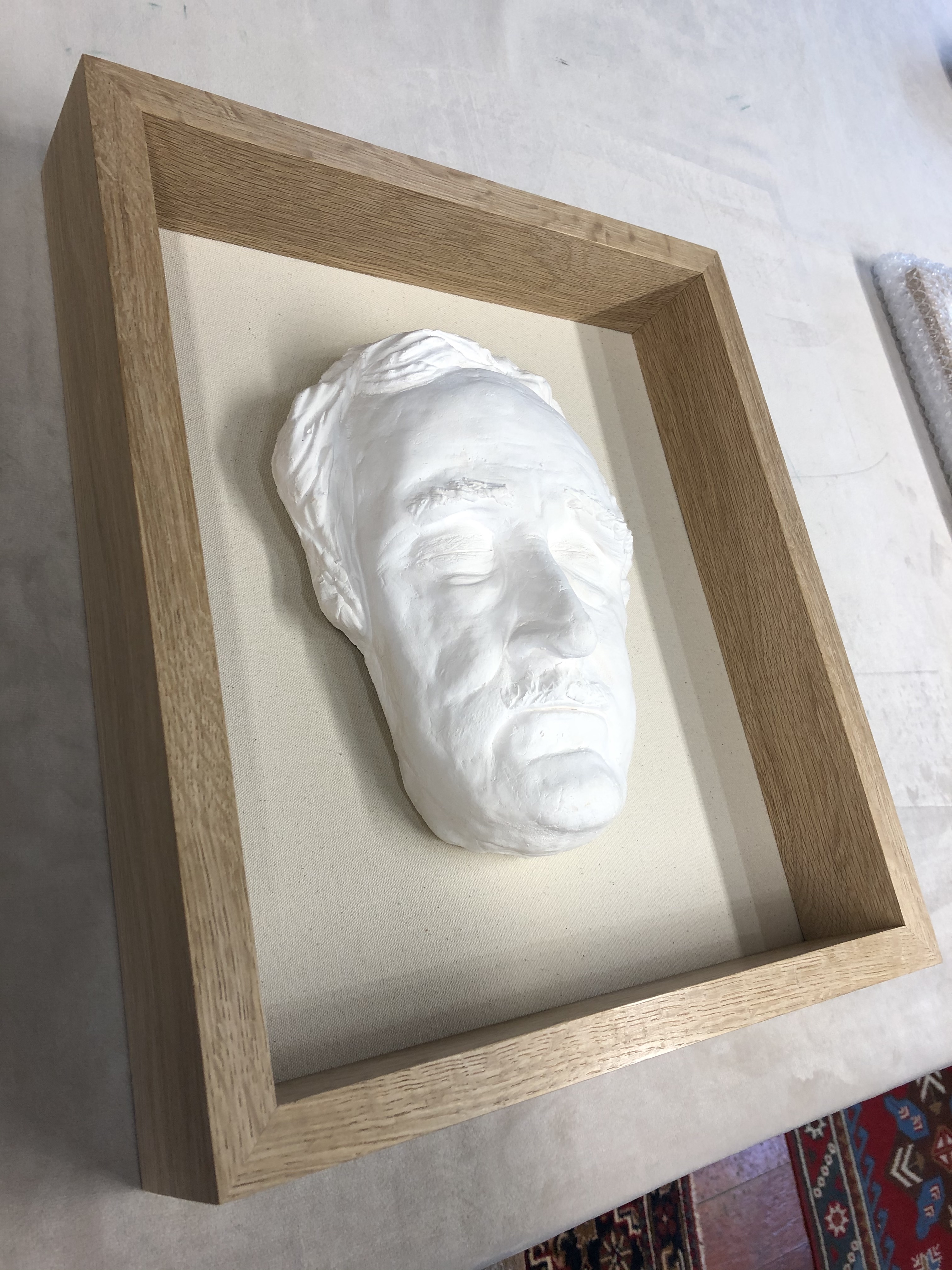 The Death Mask is of a celebrated literary figure. It was adhered onto a bespoke cut, canvas covered board, box framed in solid oak with a hand waxed finish.