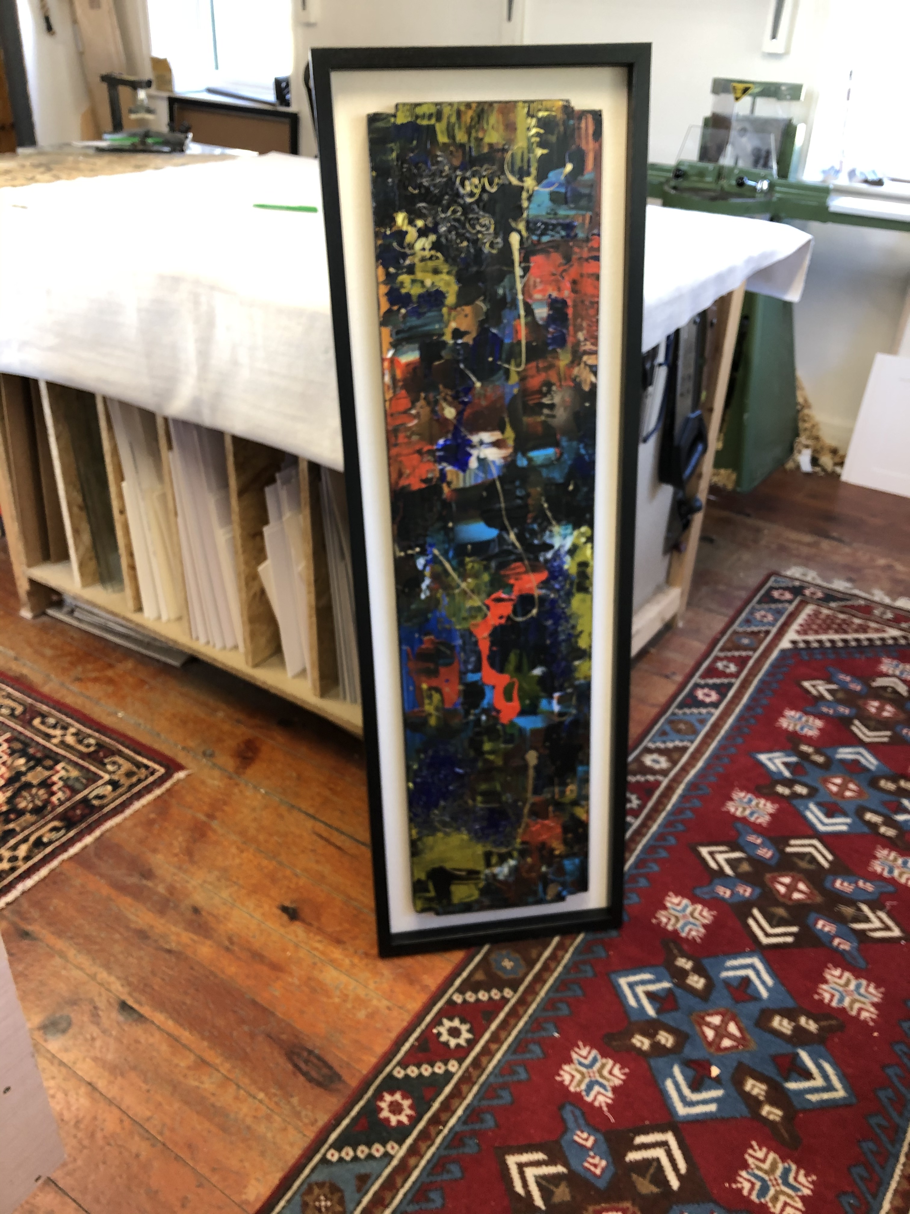The drawer front is an abstract painting in acrylic and is adhered onto canvas covered bespoke cut board and box framed in hand stained black ash.