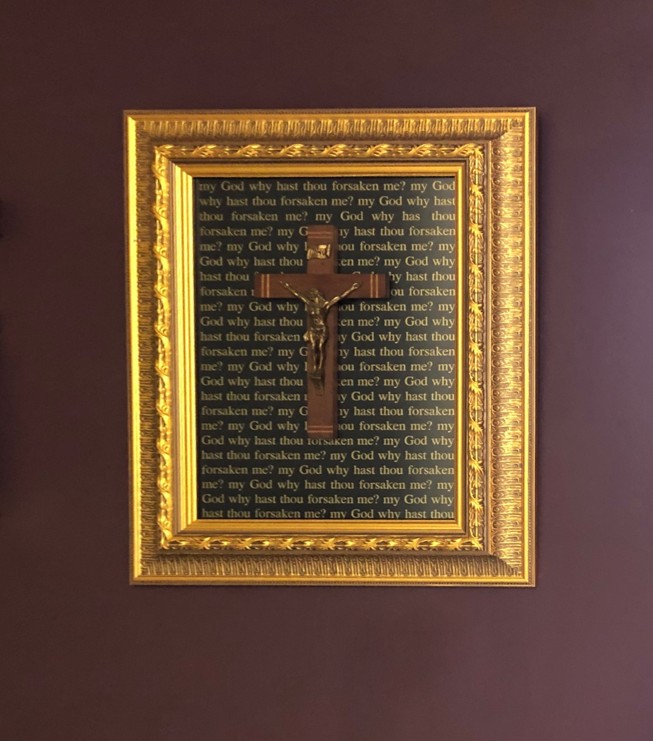 The DADA inspired piece was created using a vintage christ corpus. A gold cut-vinyl transfer was adhered onto a black mount board back and framed with a high quality ornate gilt frame. The piece was then glazed with non reflective glass and the object was adhered to the glass.