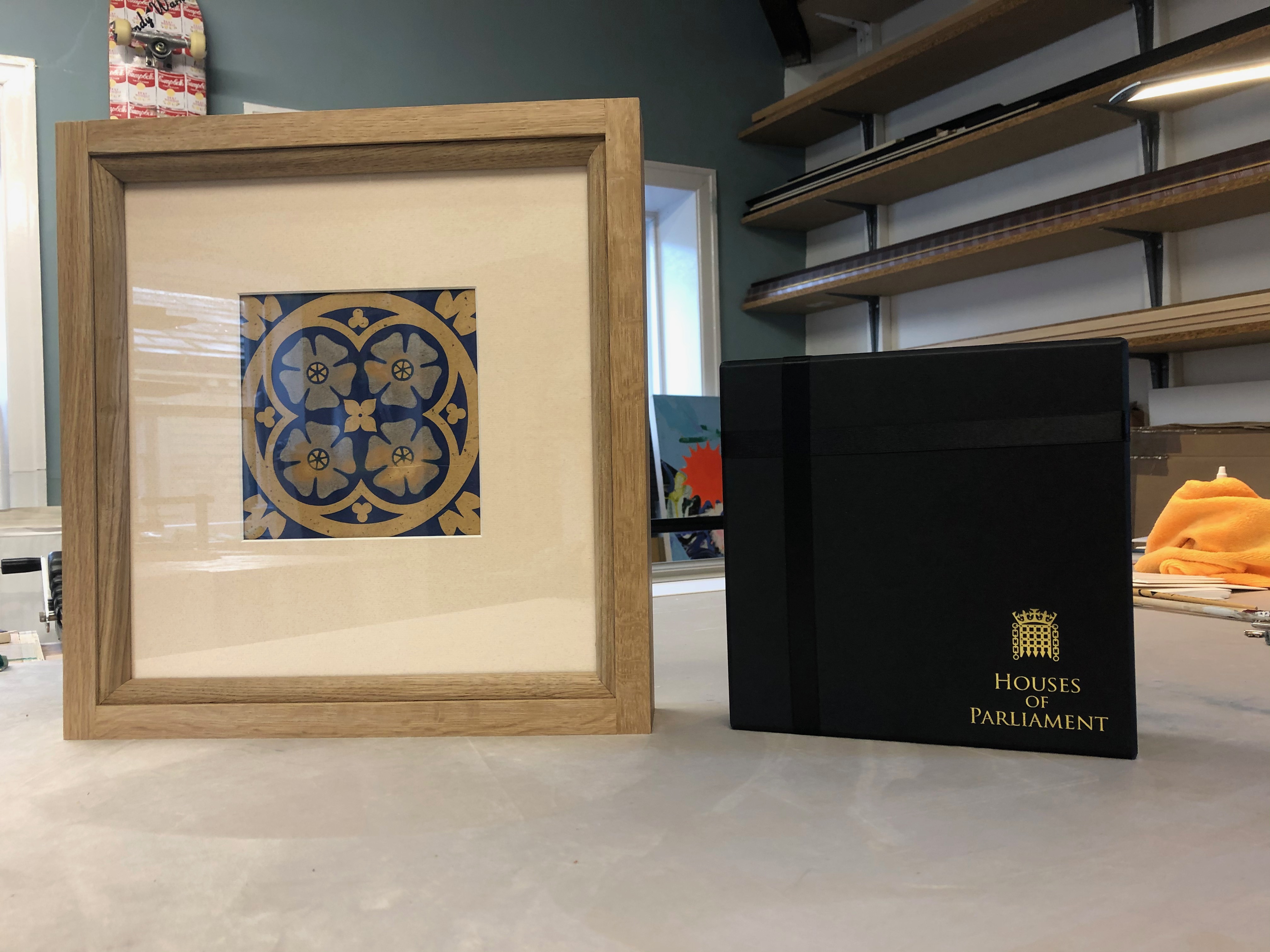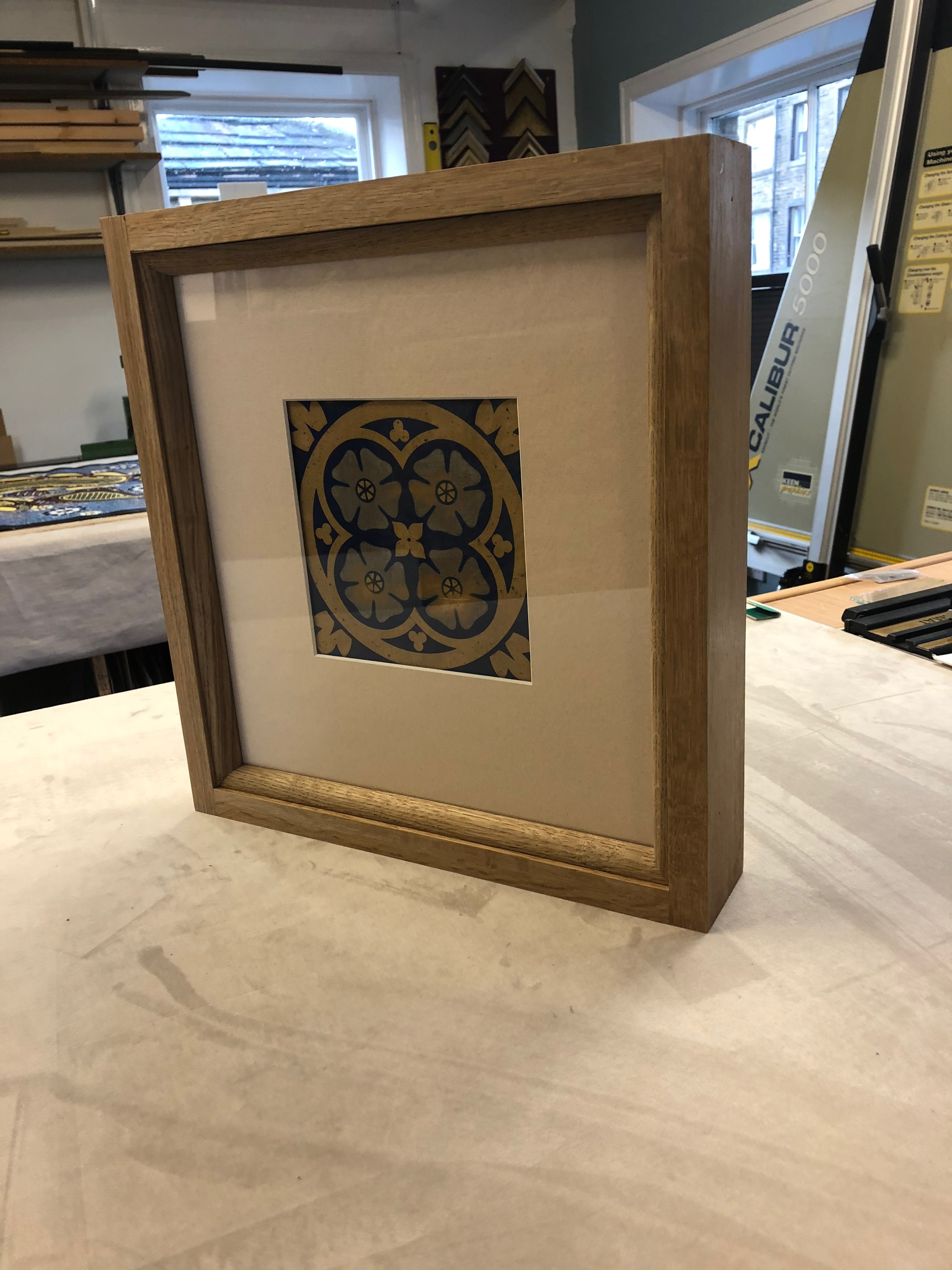 This object was 35mm thick and had to be viewed from both sides. The solution was a solid oak custom, double glazed, double mounted bespoke frame.