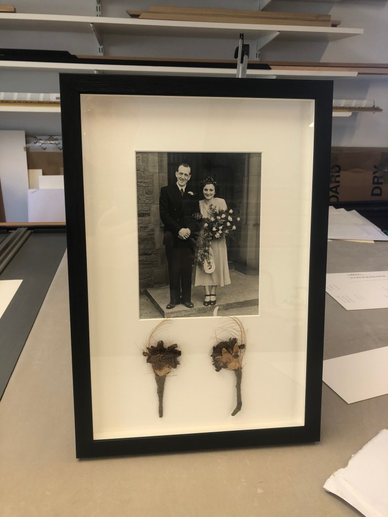 Framed using UV glass in a deep box frame, displaying the boutonnières worn on the day.