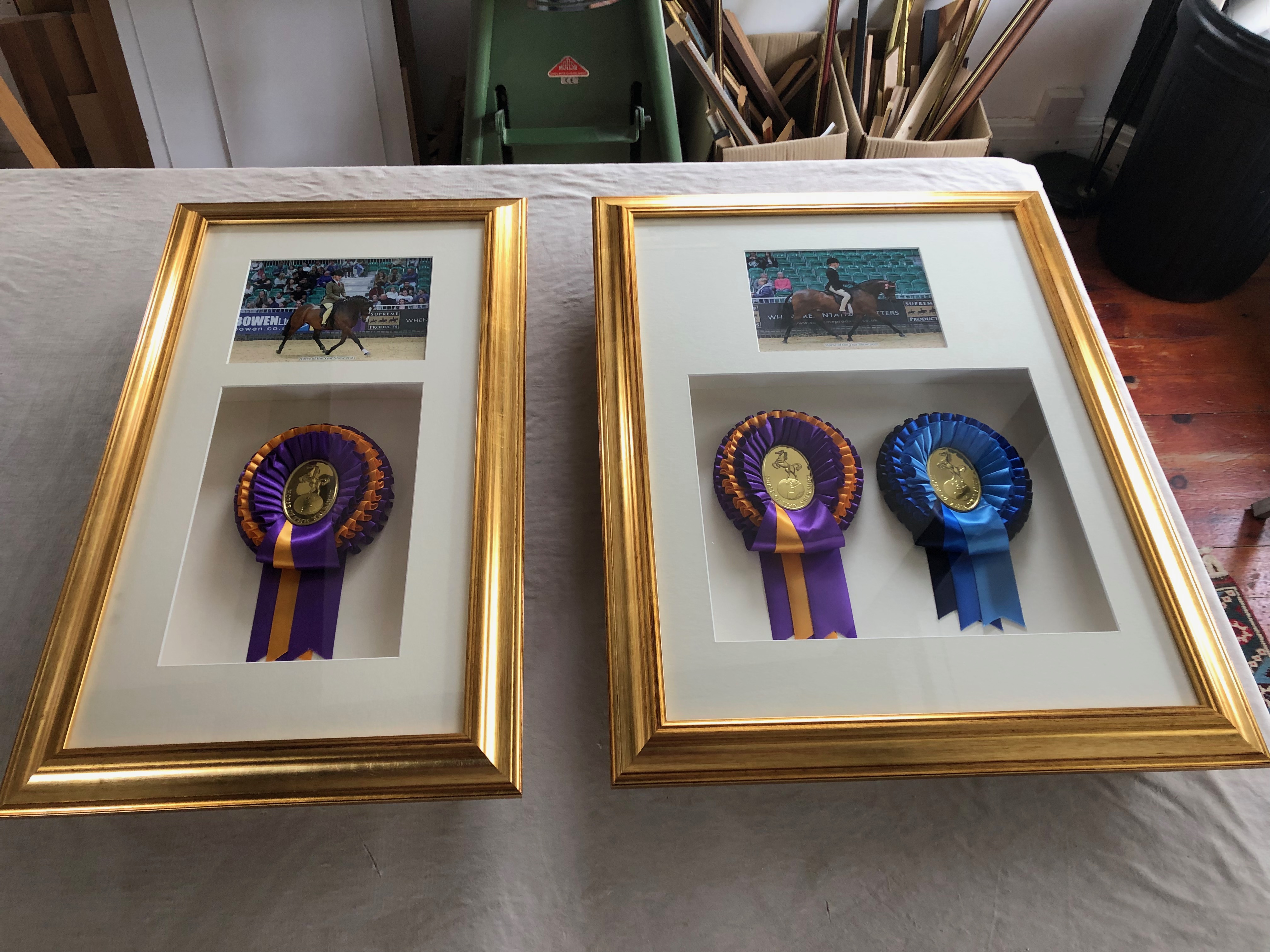 Rosettes framed with photographs for a special presentation. This method works for boxing gloves and other 3d objects.